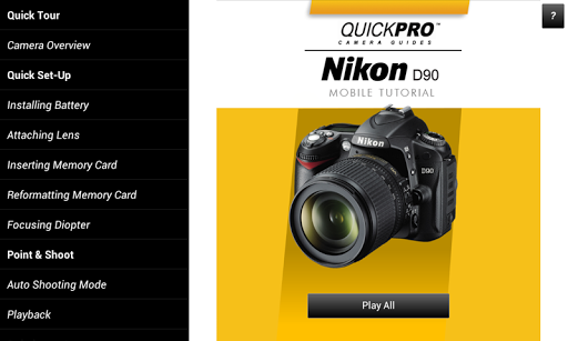 With Android Camera Guides from QuickPro, you'll never have to miss the shot of your life again. QuickPro Camera Guides, the leading producer of Camera Guide tutorials, announces Nikon D90. Now you have ready to go instruction of all camera functions where you need it and when you need it.