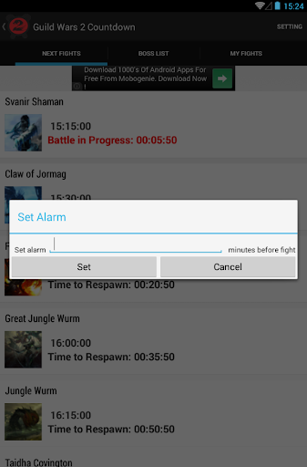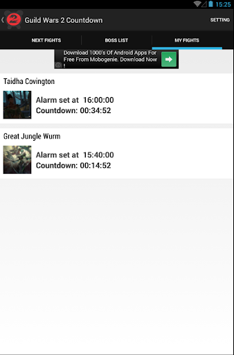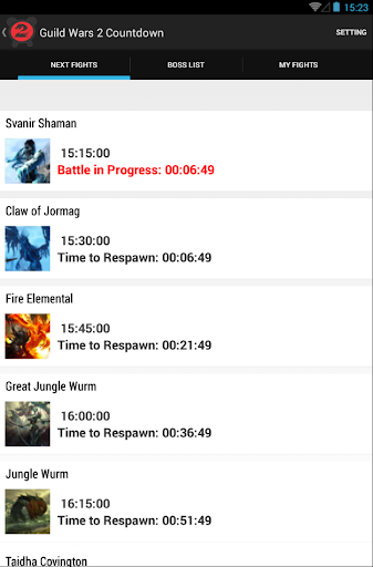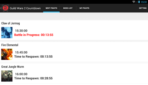 Guild wars 2 Countdown app enables you to quickly check the time when a boss is about to re spawn. you can easily select the boss you want to fight and add it to your fight list and when the time comes, an alarm will remind you of this event.