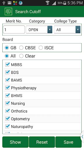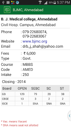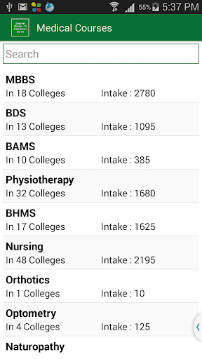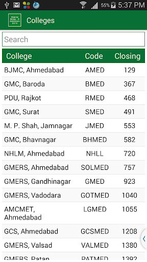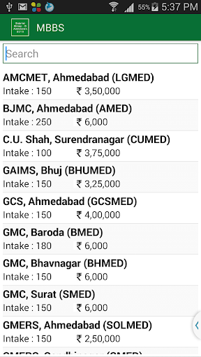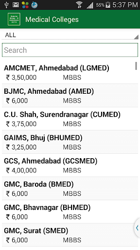 This App gives complete information of Medical\Paramedical Admission 2015 like, Medical (M.B.B.S.), Dental (B.D.S.), Ayurvedic (B.A.M.S.), Physiotherapy (B.P.T.), Homeopathy (B.H.M.S.), Nursing (B.Sc.), Orthotics (B.P.O.), Optometry (B.O.), Naturopathy (B. NAT), Audiology(B.A.S.L.P.) Courses in Government, Municipal, Grant-In-Aid and Self Financed Colleges in the state of Gujarat after qualifying examination (Group B or Group AB) and GUJCET.