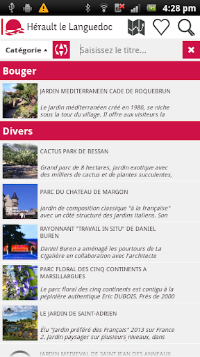 Tout est accessible sur plan, itinéraire, historique, coups de coeur et recherche par titre.