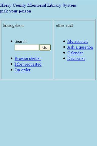 This is the Horry County Memorial Library Online catalog. From here you can browse books, DVDs and music that's available at all nine library locations in Horry County. You can also place them on hold for free with your library card! Just tell us which ones you want and we will deliver them to your closest library for pickup!