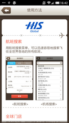 H.I.S. GLOBAL 应用程序可以选择世界上任何一个城市,迅速快捷的查询您所需的机票。 不仅可以在应用程序内进行日文、英文和中文的语言切换。 而且可以将查询后的结果用电话,邮件等在HIS世界各地的门店预约。