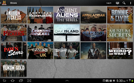 HISTORY Go is a video app for Android phone and tablet devices. Watch full-length episodes and clips for all your favourite HISTORY shows like Pawn Stars, Swamp People, Vikings, American Restoration, Ice Pilots, Yukon Gold and more! Log in with your TV service provider for access to the full library of HISTORY content.