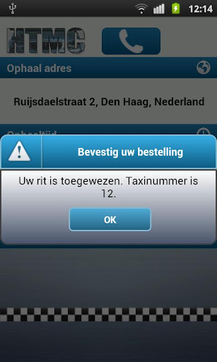 Nadat u het adres en de tijd heeft ingesteld bestelt u de taxi door op de knop "bestel uw taxi" te drukken.