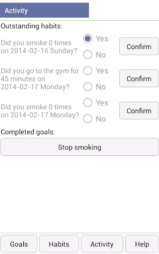 - Simple yes/no question asked each day on whether or not you practised each active habit