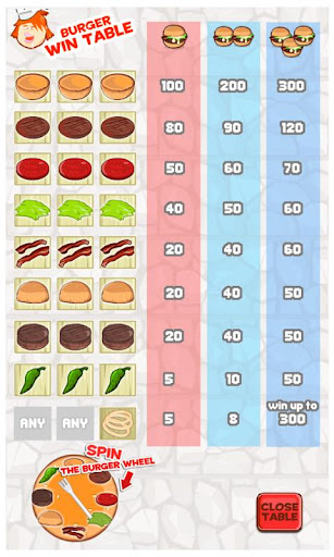 A very funny and unique Slot machine! Hamburger Slot Machine has the classic 1950's Diner theme! The reels have burger toppings and there's a "Wheel of Burgers" style spinner if you get the fried onions! All the features you love in a slot machine but also with "doubles" burger wins and a "burger Table" with 3 of a kind! Try a completely different kind of slot machine where Burgers are the currency! More fun features are coming like mini achievements!