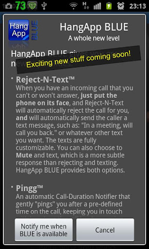 - Check out the Settings screen (use the phone's menu button to reach it) - it allows you to customize HangApp sounds, as well as other app behavior (e.g. disable HangApp when using a Bluetooth earpiece)