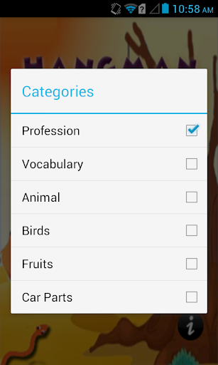 The player can select words from six different categories.