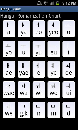 This application will quiz you on Korean Hangul characters and prompt you to enter the correct romanization.