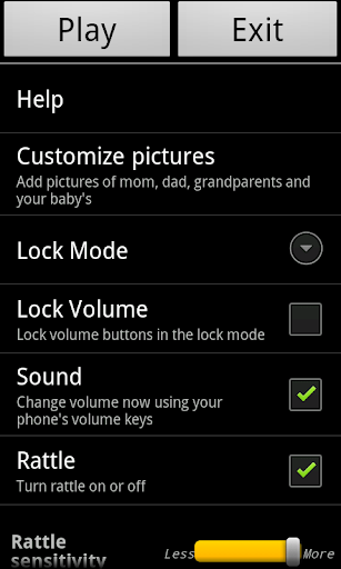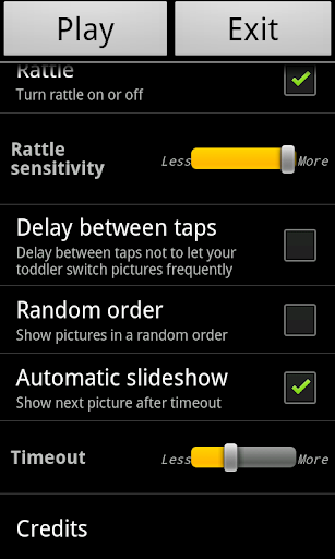 Multiple application settings (rattles sensitivity, random or sequential slide show, timeout between images, turning sound on or off and adjusting volume).