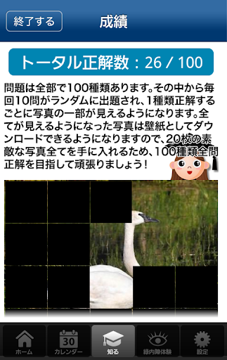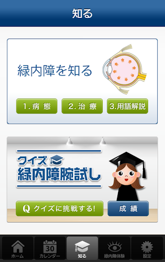 緑内障についての情報や、クイズで緑内障についての知識を深める事が可能です。正解数によって、すてきな壁紙をプレゼント。頑張って全ての壁紙を手に入れましょう!