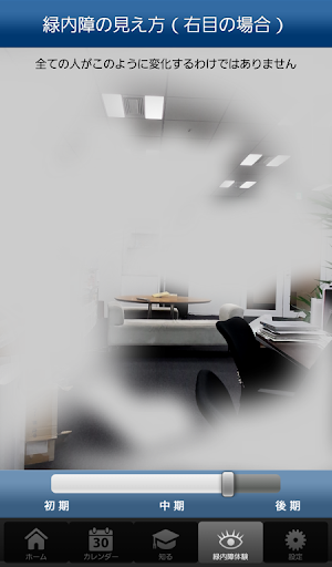 Happy eyeアプリでは、緑内障の初期から後期までの視野の変化を体験することが出来ます。緑内障の進行に伴って身の回りのものが見えなくなってゆく状態を、カメラのスライダーを使って疑似体験できます。