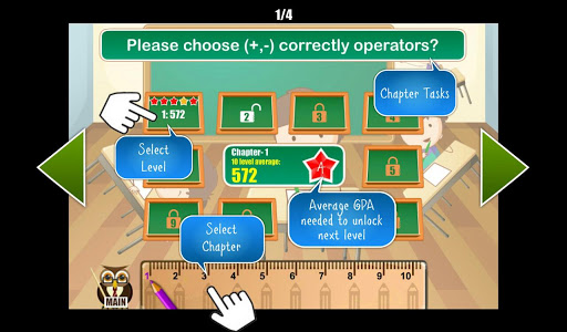 2. There are 10 chapters each consists of 10 levels in "Operations mode", where math operations are mixed and it is getting harder in each chapter. In chapter 6 more pupils will be added therefore making problems to solve more challenging.