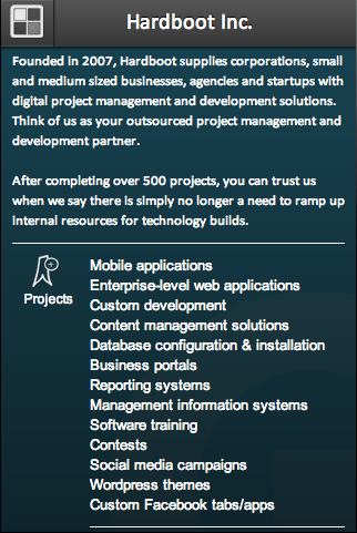 Founded in 2007, Hardboot supplies corporations, small and medium sized business, agencies and startups with digital project management and development solutions. Think of us as your outsourced project management and development partner.