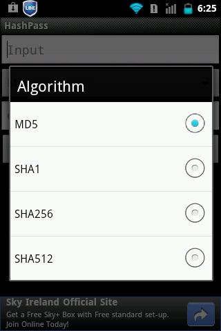 There are currently four algorithms available in the app. MD5 , SHA1 , SHA256 & SHA512.
