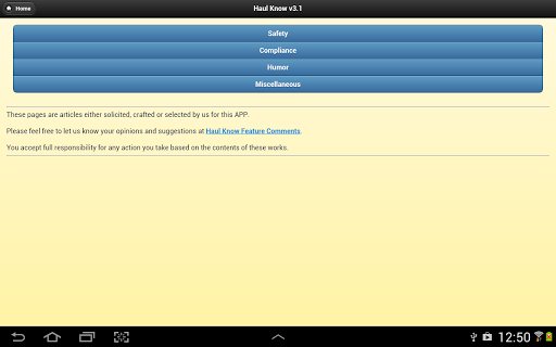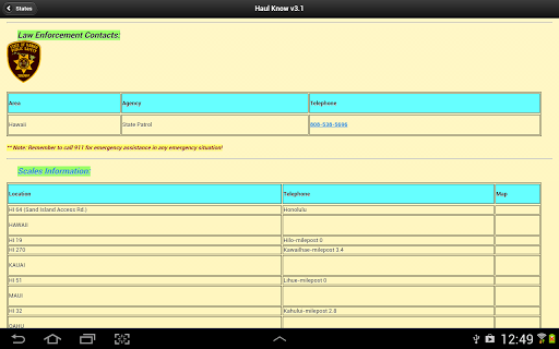 The goal of the Haul Know application is to create a ready reference of trucking related information for Over The Road (OTR) drivers. We have designed the app to keep this information available even when you have no network connection available. We also provide frequent updates via the Play Store so you will have the latest information handy even in those places like the Bad Lands of Utah.