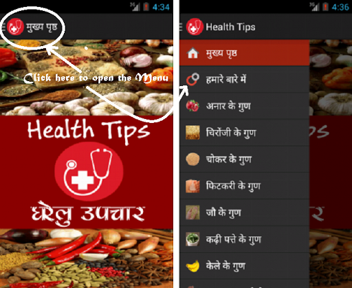 "Health Tips" is an Android App and available in Hindi. It is very useful to know the various home based remedies. You'll be knowing the Medical use of many food items and spices which are usualy available in our kitchen.