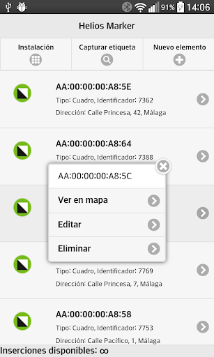 Helios Marker es una de las utilidades disponibles para el instalador de sistemas Helios, que permite registrar la posición exacta de los elementos Helios: luminarias, cuadros, repetidores, servidores intermedios y servidores de aplicación. La aplicación utiliza la cámara y GPS del teléfono móvil para poder capturar la dirección MAC del elemento a registrar y registrar la posición exacta del dispositivo. Una vez se registran los elementos deseados es posible enviar vía e-mail el fichero de instalación a un PC, donde podrá procesarse y analizarse gracias a la utilidad Helios Assigner.