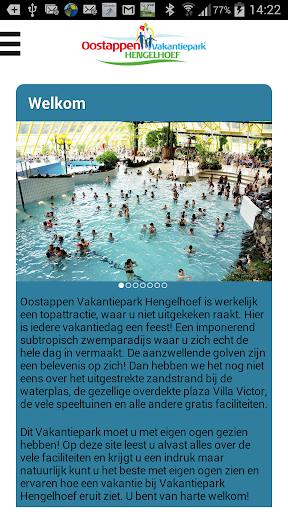 Van harte welkom bij Oostappen Vakantiepark Hengelhoef. Het motto ‘vakantie voor iedereen’ staat bij ons centraal. Om u altijd en overal zo goed mogelijk te kunnen informeren hebben wij deze Hengelhoef app ontwikkeld. Hier vindt u alle informatie die u nodig heeft voor en tijdens uw vakantie en brengen wij u graag helemaal in de vakantiesfeer.