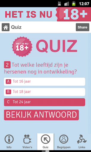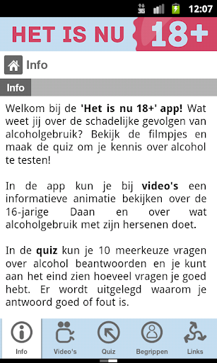 Welkom bij de 'Het is nu 18+' app! Wat weet jij over de schadelijke gevolgen van alcoholgebruik? Bekijk de filmpjes en maak de quiz om je kennis over alcohol te testen!