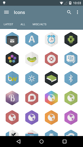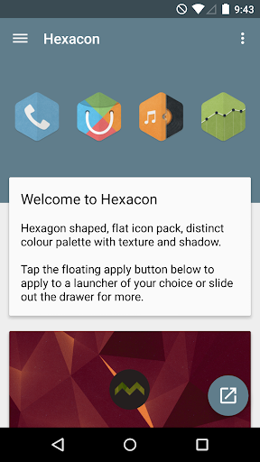 Hexacon shaped form, with a distinct colour palette, texture and shadow covering half the icon. This is an icon pack for various launchers.