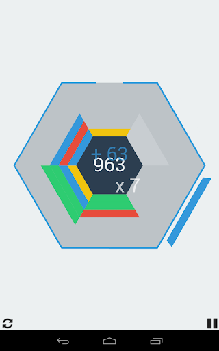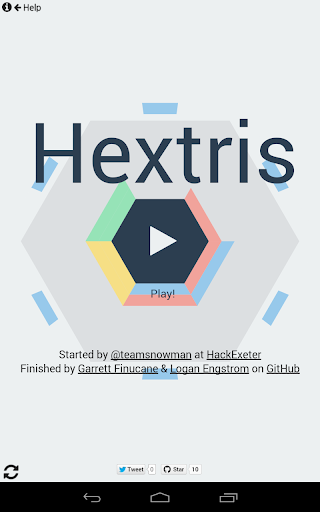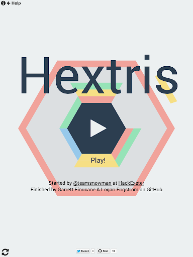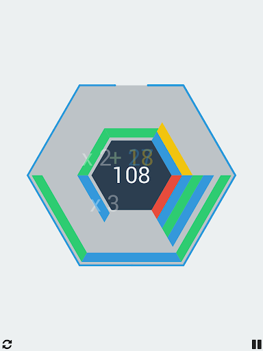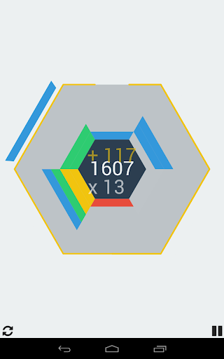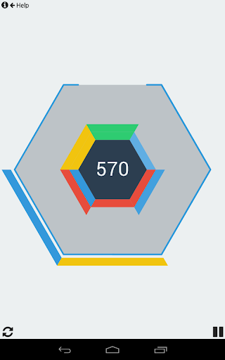 HEXTRIS is a fast paced puzzle game inspired by Tetris. Blocks start on the edges of the screen, and fall towards the inner blue hexagon. The objective of the game is to prevent the blocks from stacking outside the area of the grey hexagon. To do this, you must rotate the hexagon to collect different stacks of blocks on each face. Aim to connect 3 or more blocks of the same color. When they match up, those 3 blocks are destroyed, and the blocks above them slide down. Destroying multiple series of blocks grants combos, whose durations are indicated by a quickly receding outline around the outer hexagon. You lose once a stack forms outside the outer boundary!