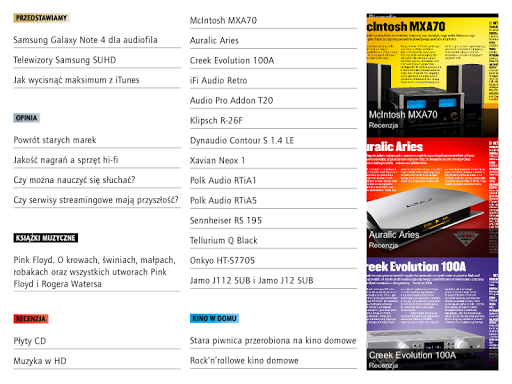 Artykuły do każdego wydania tworzone są przez doświadczonych dziennikarzy polskich jak i brytyjskich – tłumaczenia z angielskojęzycznych wydań Hi-Fi Choice oraz Home Cinema Choice. Przy czym teksty autorów zagranicznych są każdorazowo adaptowane do potrzeb naszego rynku i uwzględniają nasze realia. Dzięki temu nasze pismo zachowuje najwyższy poziom merytoryczny i jest jednym z najbardziej opiniotwórczych periodyków branżowych w Polsce. Wyróżnienia redakcyjne i rekomendacje przyznawane dla poszczególnych urządzeń są wyznacznikiem ich najwyższej jakości, a tym samym wskazówką dla potencjalnych nabywców. Dlatego nasze czasopismo jest świetnym przewodnikiem prezentującym najlepsze urządzenia do odtwarzania dźwięku i obrazu – odtwarzacze CD/DVD/Blu-ray, wzmacniacze, amplitunery, streamery, kolumny, słuchawki, telewizory, kable, akcesoria i gadżety. Magazyn Hi-Fi Choice & Home Cinema zadebiutował w Polsce w 2006 roku.