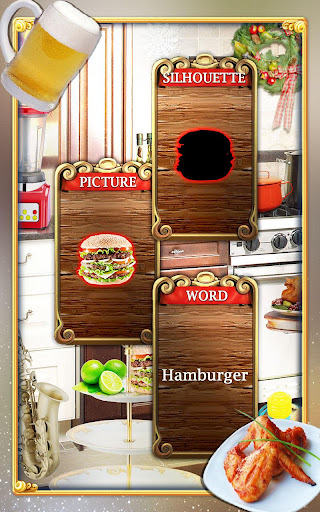 Hidden Objects - New Year Kitchen features several different kinds of hidden object puzzles to solve. Sometimes you'll have pictures of items to find, making it easy to complete the challenge in each room. Other times you only get to see a silhouette of each item you need to find. The hardest puzzles give you a list of words and challenge you to seek out the objects without knowing what they look like. Talk about tough puzzle levels!