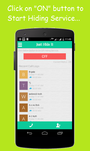 1 - Enable Hiding Service By Clicking on "ON" button on your home screen. This will on the hiding function of the app for all your private contact.