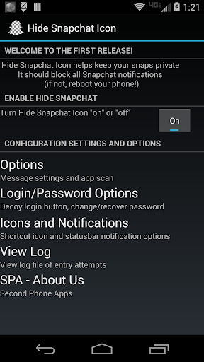 Also, when you tap the icon it will take you to a "login" screen. You then need a password and it will then take you Snapchat! There are a number of settings options (like custom notifications, in case you don't like the decoy subscription notification).