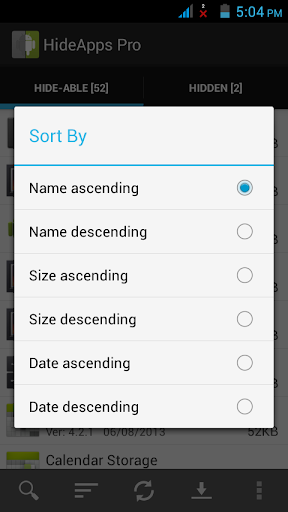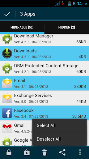 • Swipe-able tabs which list hide-able and hidden apps.