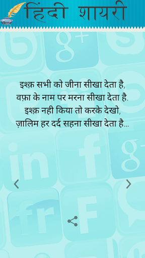 Also you can share the best SHAYARI in collection with your friends not only by SMS messaging, but also by Facebook, Twitter, instant messengers like Whatsapp, Hangouts, etc !