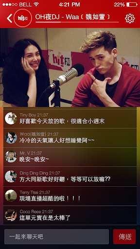 想聽什麼歌?有什麼話想講?有話想告訴你的偶像?即時聊天室讓你直接LIVE參與節目內容。