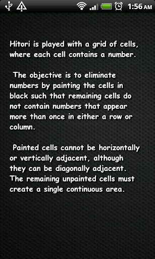The aim of the game is to paint out some cells in such way that there are no duplicate numbers in any row or colunm. Painted cells cannot share an edge. And all the unpainted cells must be connected horizontally or vertically in a single group.