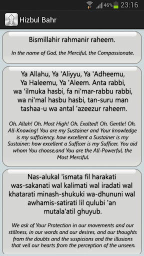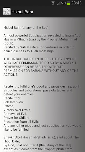 By God, I did not utter it [the Litany of the Sea] except as it came from the Prophet pbuh, from whose instruction I learned it. 'Guard it' he said to me, 'for it contains the Ism al-'Adhim-Greatest name of God'. It is not recited in any place without security reigning there. If it had been with the inhabitants of Baghdad, the Tatars would not have taken the city. On his death bed Imam Shadhili gave Naseeha-counsel to recite his Litany of the Sea (Hizb ul Bahr) often, and he said, 'Teach it to your children for the Ism al-'Adhim (Greatest name of God) is in it.