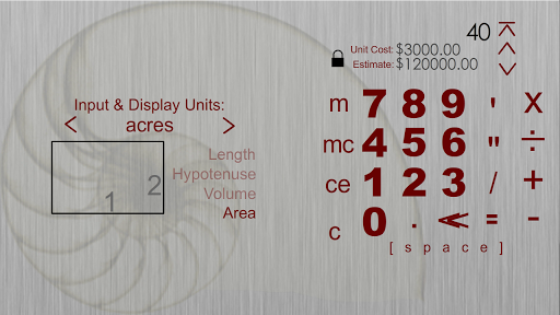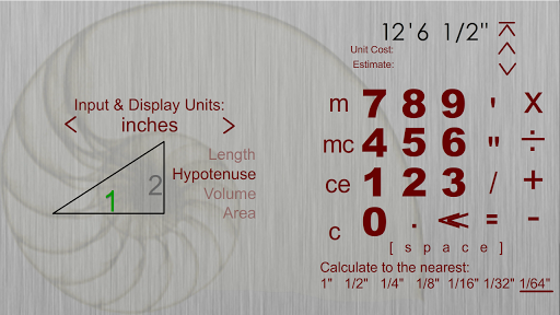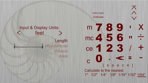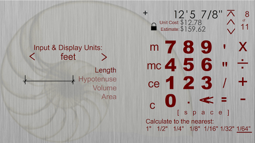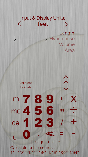 Having this estimating calculator installed on your Droid can save you time and money. Estimate lengths, areas, volumes, and hypotenuses by entering distances in feet and inches (with fractions). Each distance is stored in a virtual tape to allow revisions, corrections, and quick updates. Enter unit price to calculate costs