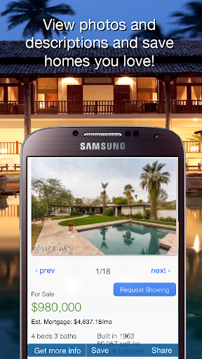 This free Android home search app is customized and optimized for our local market. Find real estate listing details, share your favorite homes on Facebook and Pinterest, email homes and photos to both your family and friends, tag homes as your favorite, add and remember saved home searches, unlock any home for a tour, and view photo slideshows. With a tap, see pictures and detailed information on all homes for sale in vivid high resolution clarity.