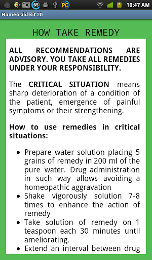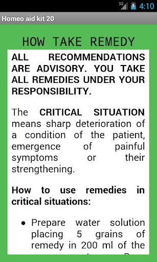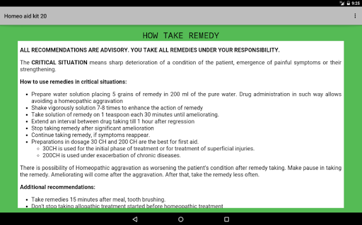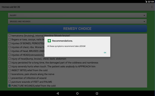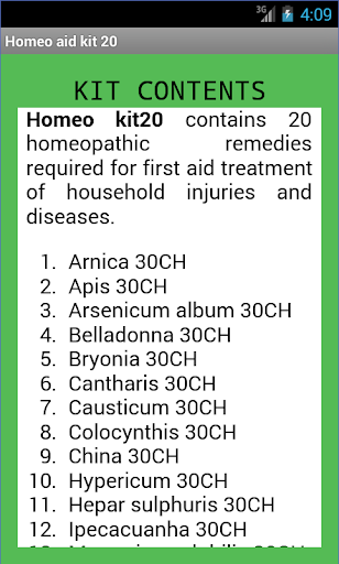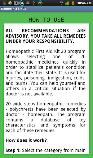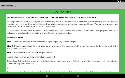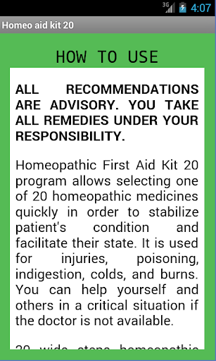 Homeopathic First Aid Kit 20 program will allow you to quickly select one of 20 homeopathic remedies. It suitable for injuries, poisoning, indigestion, colds, burns. Allows you to quickly stabilize the patient's condition, facilitate its state. A small number of products will allow you to take them to the sea, camping, on a business trip. You will be able to help themselves and others in a critical situation if the doctor is not available.