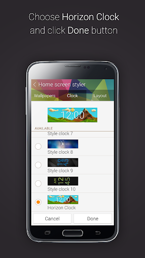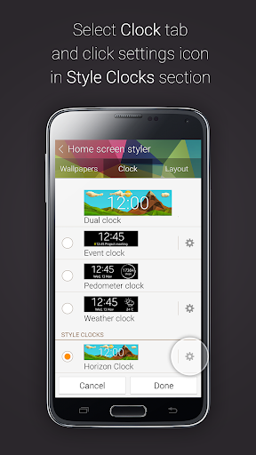 Choose Home screen styler > Clock > Style Clocks settings icon