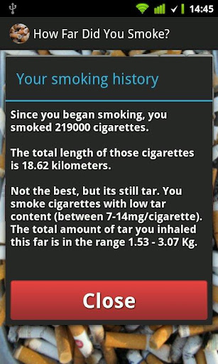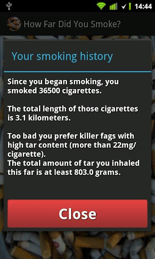 Calculate your smoking history. Enter how many cigarettes you smoke each day, tar content and how long time you have been smoking. The app will output the total number of cigarettes smoked, the total length of all those cigarettes as well as the total amount of tar you inhaled.
