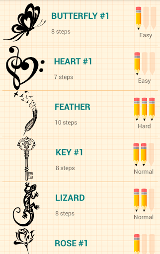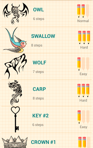 In simple steps allow you to perform fantastic drawings, just take a paper and a pencil, choose the tattoo that you like and follow step by step instructions. It is very easy to use.