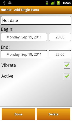 Husher keeps your phone silent when it should be. No more hush, shush, be quiet or shut up! Perfect for meetings, class, movies, dinners etc