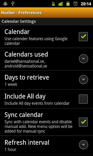 - Preferences including settings for calendar sync, filtering, vibration, notifications etc.