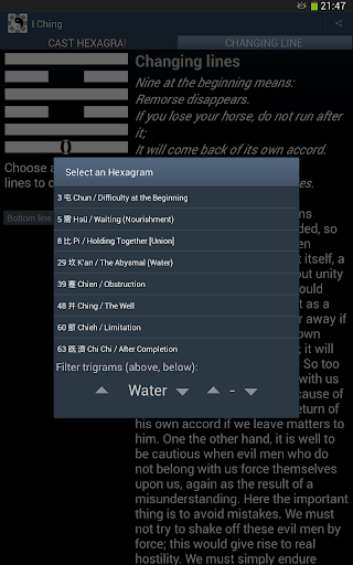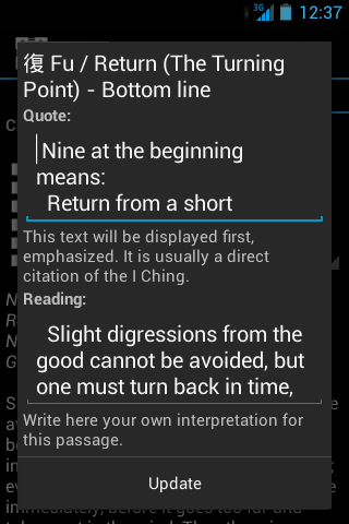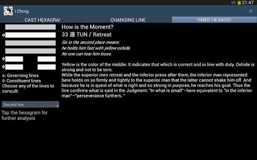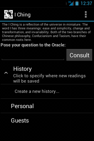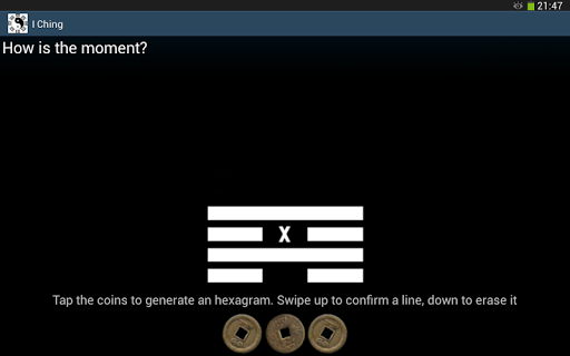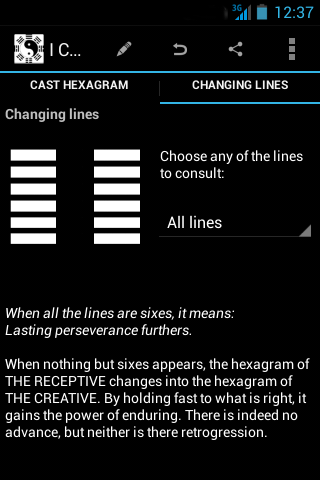 A free, complete and portable I Ching Oracle for Android OS. Includes full description of all hexagrams and changing lines, governing lines, constituent lines, history feature, saves itself on SD card or on internal storage and uses network to download definitions in order to be extra light weight. Once downloaded, readings definitions are available offline.