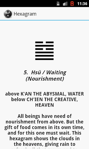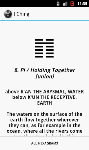 Get a new hexagram every day, I Ching is an ancient Chinese wisdom used for fortelling the future and understanding the past and present. This explanations are bas on Richard Wilhelm’s and Cary F. Baynes’ translations of the classic "I Ching: Or, Book of Changes". Also can be installed as a widget.