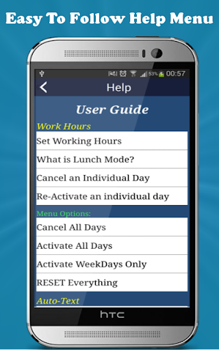- New Auto-Text (SMS) feature. This will automatically text (SMS) a customizable text to any missed call number during your work hours, (will not work on private or unknown numbers).