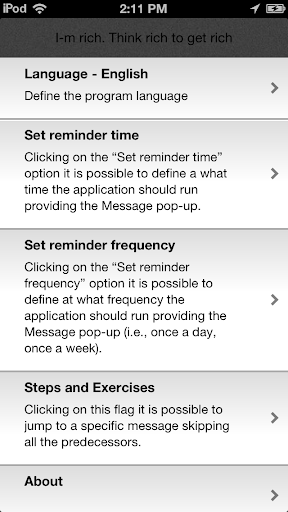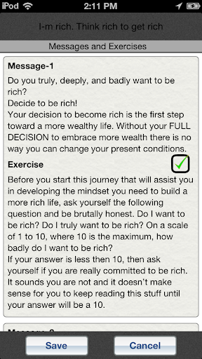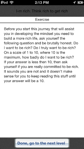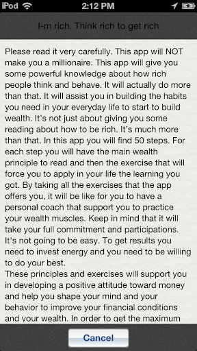 This app will give you some powerful knowledge about how rich people think and behave. It will actually do more than that. It will assist you in building the habits you need in your everyday life to start to build wealth. It’s not just about giving you some reading about how to be rich. It’s much more than that. In this app you will find 50 steps. For each step you will have the main wealth principle to read and then the exercise that will force you to apply in your life the learning you got. By taking all the exercises that the app offers you, it will be like for you to have a personal coach that support you to practice your wealth muscles. Keep in mind that it will take your full commitment and participations. It’s not going to be easy. To get results you need to invest energy and you need to be willing to do your best.