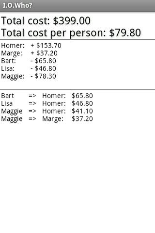 I.O.Who? is a tabsplitter-type application. It helps you divide any expenses you've had evenly on every participant in a group, taking in to account what everyone already paid.