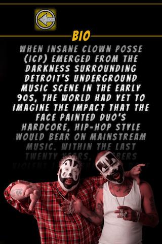App based on the Band: Insane Clown Posse. This app will blow your mind with exclusive content not available anywhere else! It's packed with biographical information, photo galleries, live updated links to Facebook and Twitter, upcoming ICP events, and more! A Juggalo's must have.