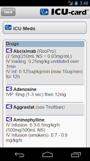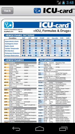 The ICU-card™ App includes drugs, dosages, formulas, equations and normal values for hemodynamics, pulmonary, renal, nutrition, etc.